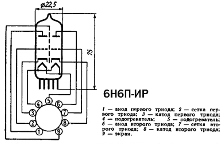 6Н6П-ИР двойной триод относится к разделу электровакуумных приборов и ламп различного назначения.По конструкции двойной триод состоит из вакуумно-герметичной, жесткой оболочки, внутри которой отсутствует кислород.